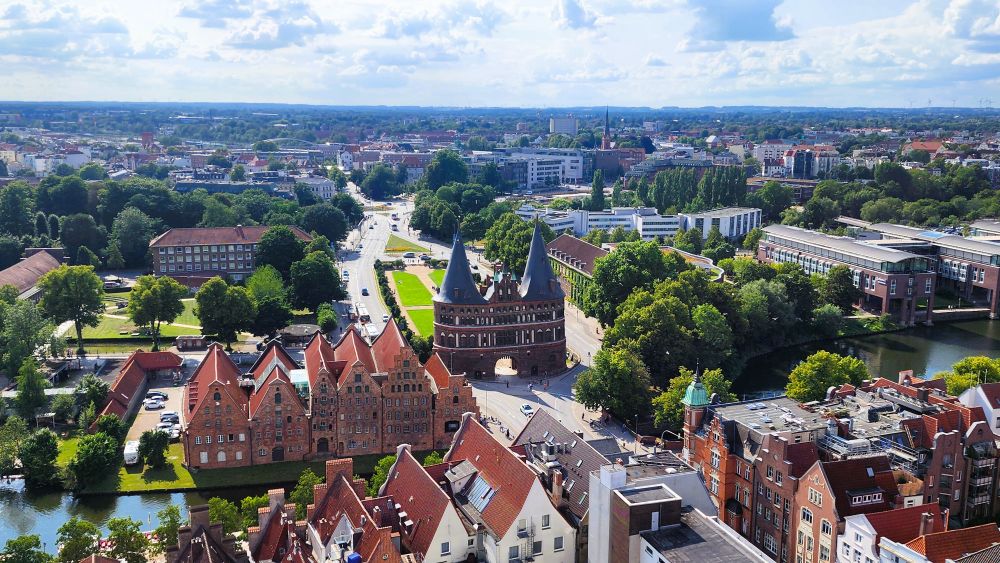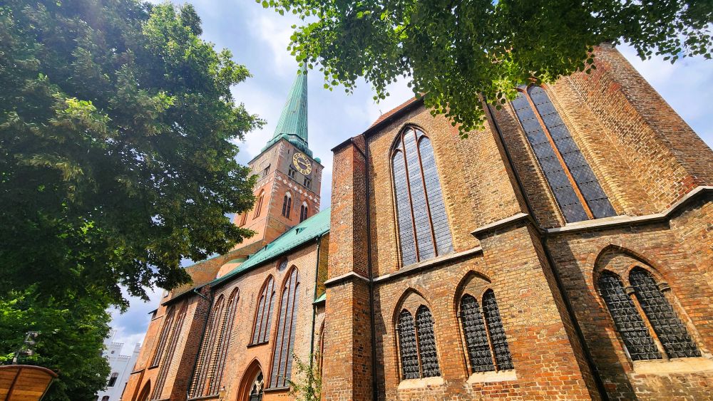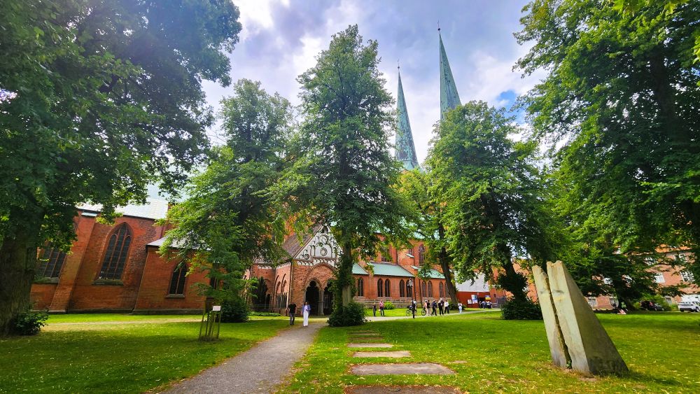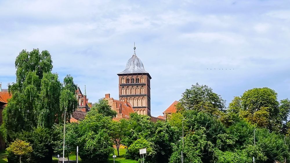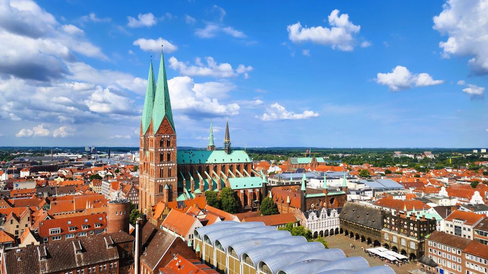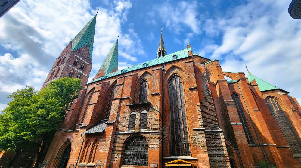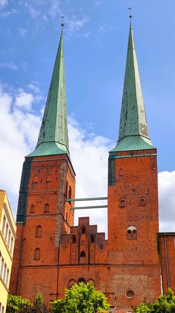 马利恩教堂(Marienkirche)——双塔。这是吕贝克最重要、最具象征性的教堂: 两座高耸的绿色铜顶塔, 是整个城市最高的建筑之一, 代表汉萨同盟的精神中心, 也是“七塔”中的 两塔。 照片里最显眼的那对高塔,就是它。