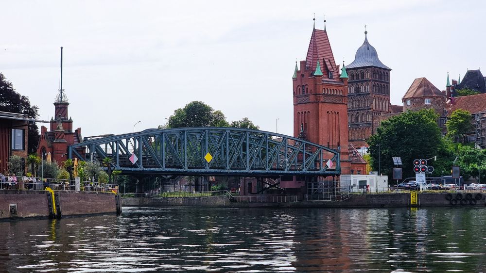 建于 1900–1908 年,Lübecker Hubbrücke(吕贝克升降桥)是典型的 工业时代升降式铁路桥。钢桁架结构, 桥面可以整体升起,让船只通过。原本是铁路桥现在是工业遗产,仍然可步行穿越。 桥上常见航道标志(照片里黄菱形、红白方块)它是吕贝克港口从汉萨时代迈向工业时代的象征。