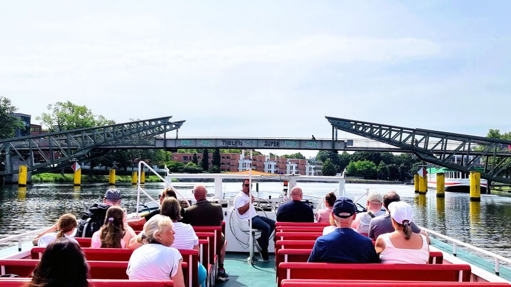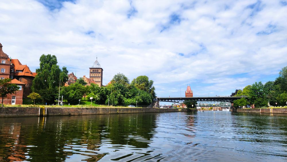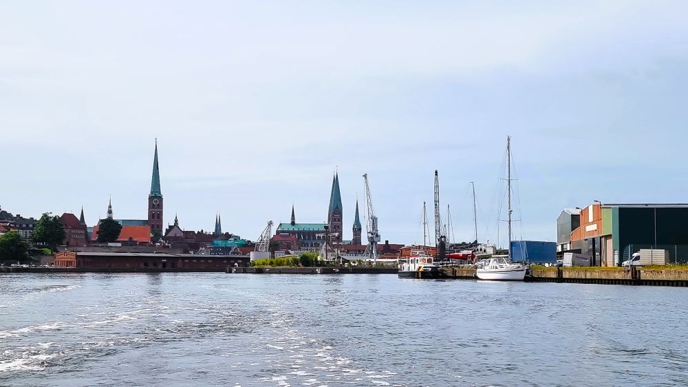 船在过铁桥前在河中心的最宽处打了一个转。吕贝克老城有 三座大教堂,共七座塔楼, 所以吕贝克也被称为“七塔之城”