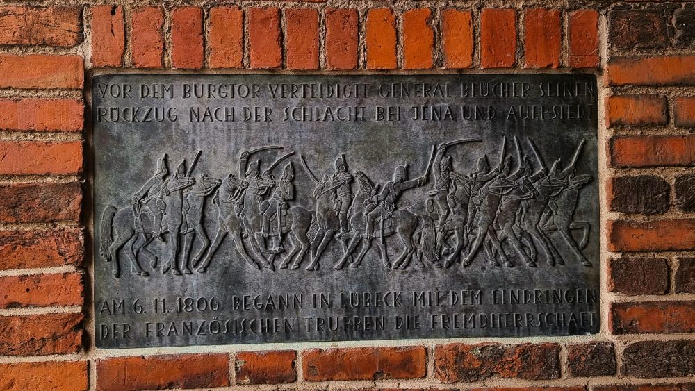 1806年11月6日,战火烧到了这个城堡门(Burgtor):布吕歇尔退入吕贝克,试图利用这座中世纪城墙进行最后的抵抗。 拿破仑麾下的三位元帅(贝尔纳多特、苏尔特和缪拉)率领法军追击至此。尽管布吕歇尔在城堡门前拼死防守(正如浮雕上展现的骑兵激战),但法军最终还是强行突破了城门,攻入了吕贝克。