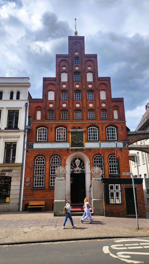 右侧的红砖山墙建筑(阶梯状屋顶)是 Lübeck 的标志性建筑风格:阶梯山墙, 典型汉萨同盟城市的商人住宅, 多为 16–18 世纪建筑。
