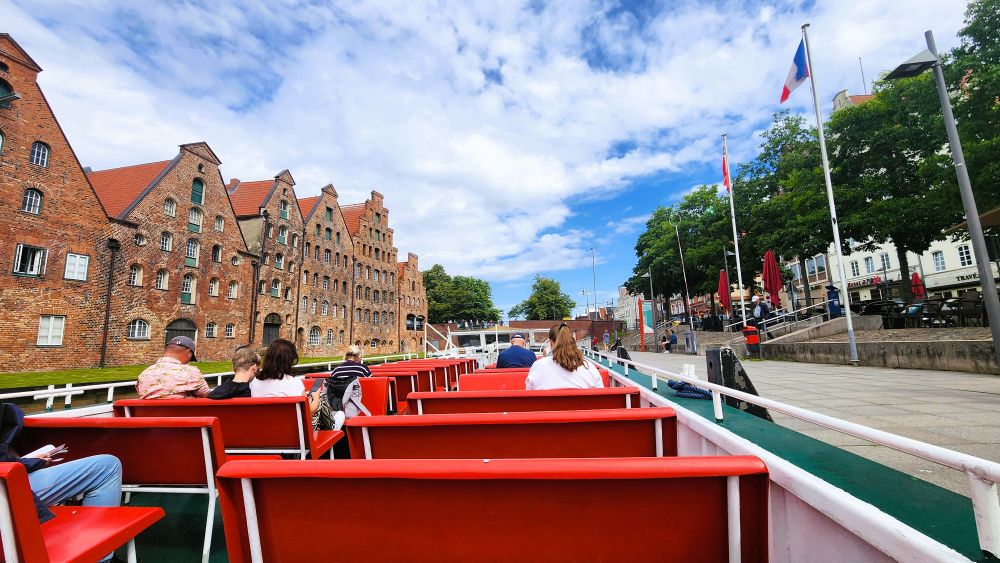 船又回到了Holstentor西门北侧的 Untertrave 河岸, 面向老城中心, 正对 St. Petri Kirche。