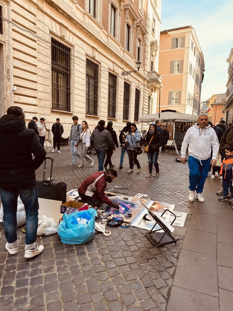 前一年去的巴黎,也是二月份,但是在著名的塞纳河畔,上午十点多还不见街摊营业的迹象,然而十点的罗马,不要说店铺都开门营业,街上的露天商铺也早已开张营业,就连街头艺人们也弹奏的弹奏,画画的画画,该干啥都在干啥了。巴黎的慵懒在这里完全无踪。