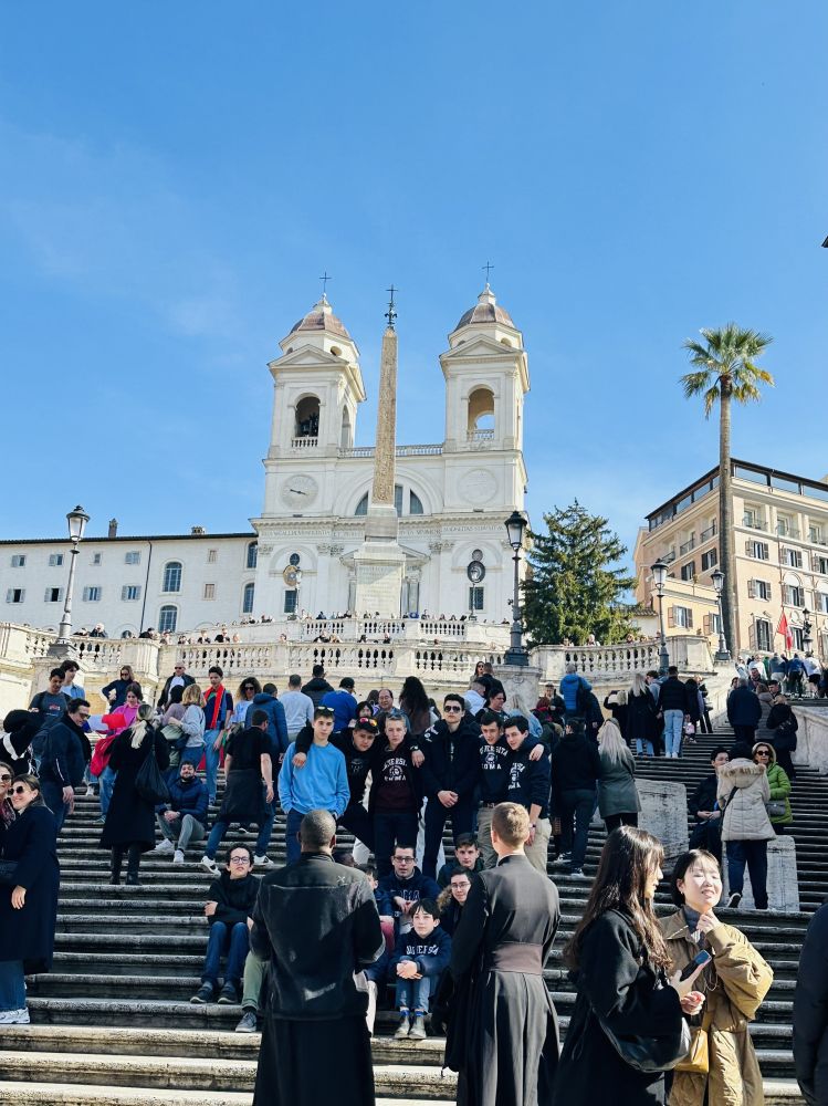 时间尚早,我知道就在Trevi许愿池不远处,还有一处闻名遐迩、宛如画卷般铺展的地标——西班牙台阶(Spanish Steps)。这条以典雅闻名的台阶,在阳光下宛若白色波浪,自西班牙广场徐徐升起,直通山顶的圣三一教堂(Trinità dei Monti),成为无数画家与游人的灵感源泉。西班牙台阶于十八世纪初建成,由波旁家族出资、由建筑师弗朗切斯科·德·桑克蒂斯(Francesco de Sanctis)设计,总计135级,被誉为“欧洲最美的楼梯”。