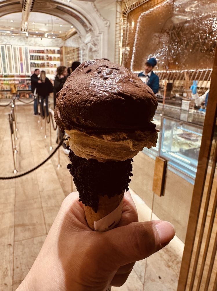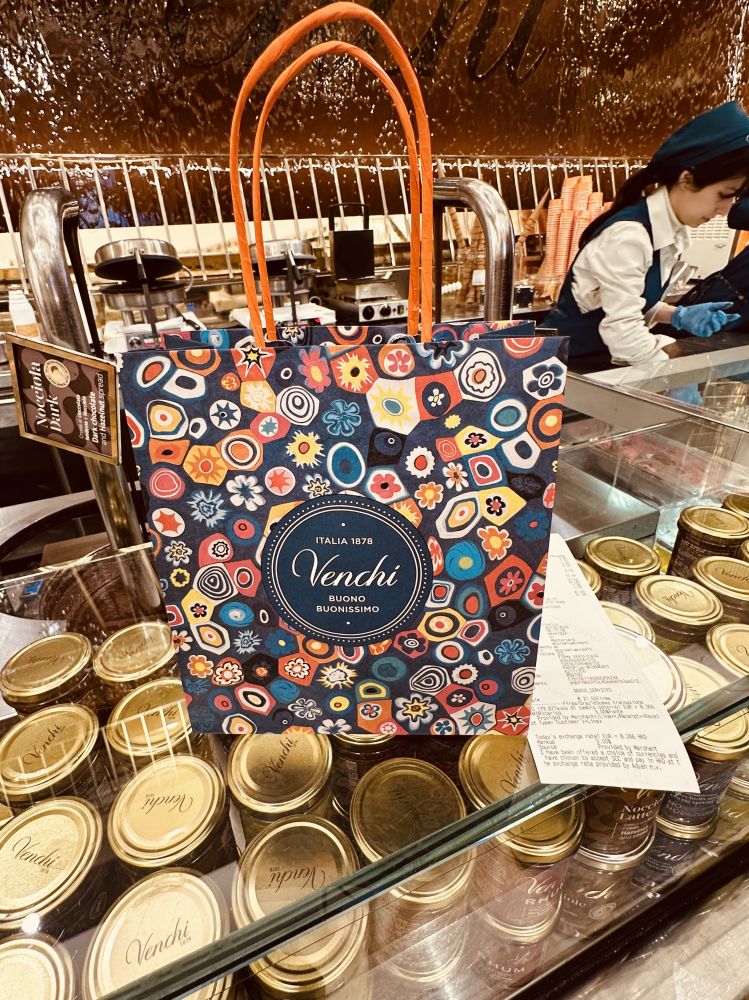 这里绝对是巧克力狂热分子在罗马的梦幻圣地。一踏进店门,我仿佛掉进了“甜蜜宇宙”。货架上色彩缤纷琳琅满目的巧克力像具有魔力的宝石向我发出诱惑,空气里飘着浓郁的可可香,大大强化了诱惑力,仿佛向我召唤“来嘛,别管夜已深!这里有馥郁丝滑的松露巧克力,经典的榛果夹心,还有那招牌的意式Gelato,让我帮你配上厚厚一层巧克力酱,不是“甜品界的爱马仕”是什么? 不管你选哪一款,保证都能让你忘掉旅途的疲惫。”我这个黑巧克力狂热分子,每天饭后不吃几小块黑巧克力就觉得不完美,所以到了Venchi就如米老鼠掉进了米缸,就算已是半夜,不吃个巧克力味的gelato, 不买几盒黑巧克力,怎么对得起自己?