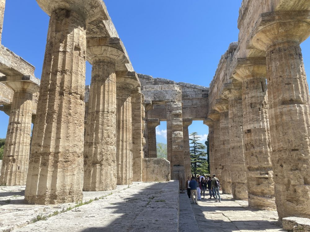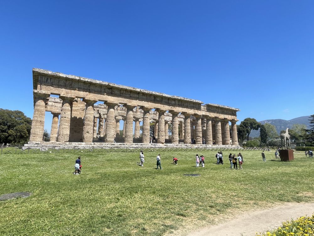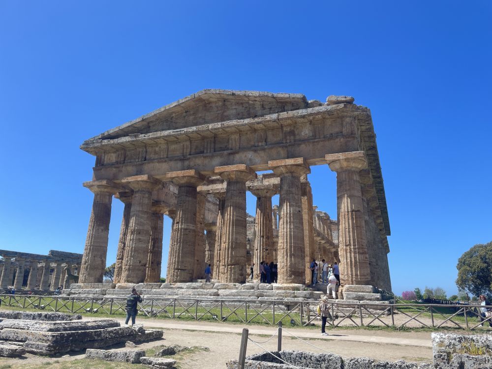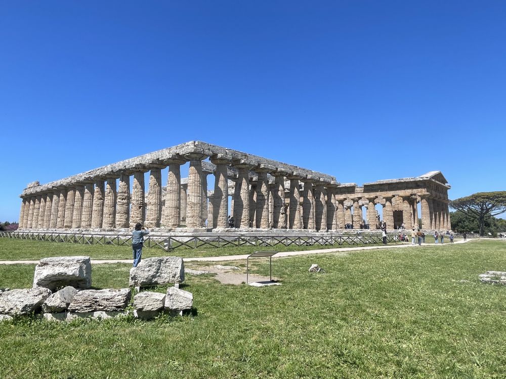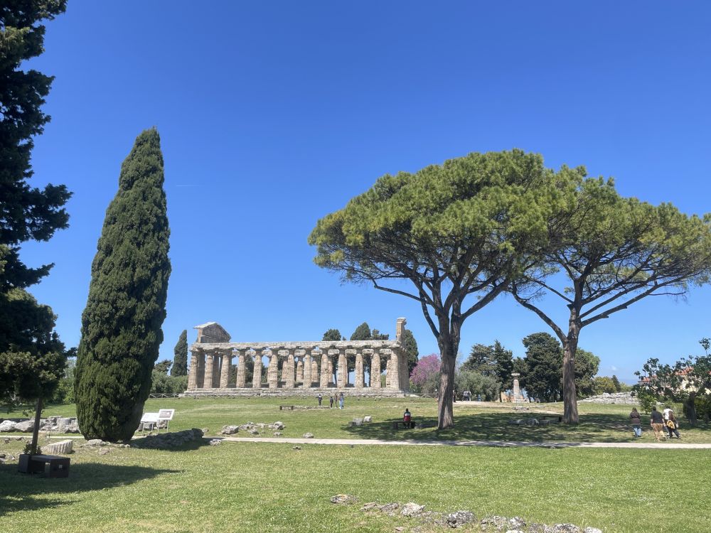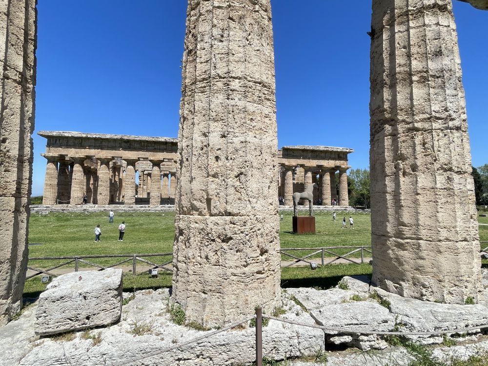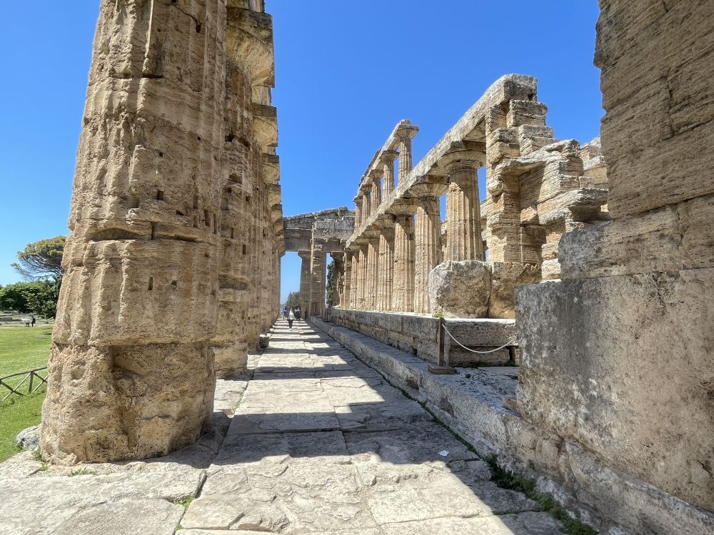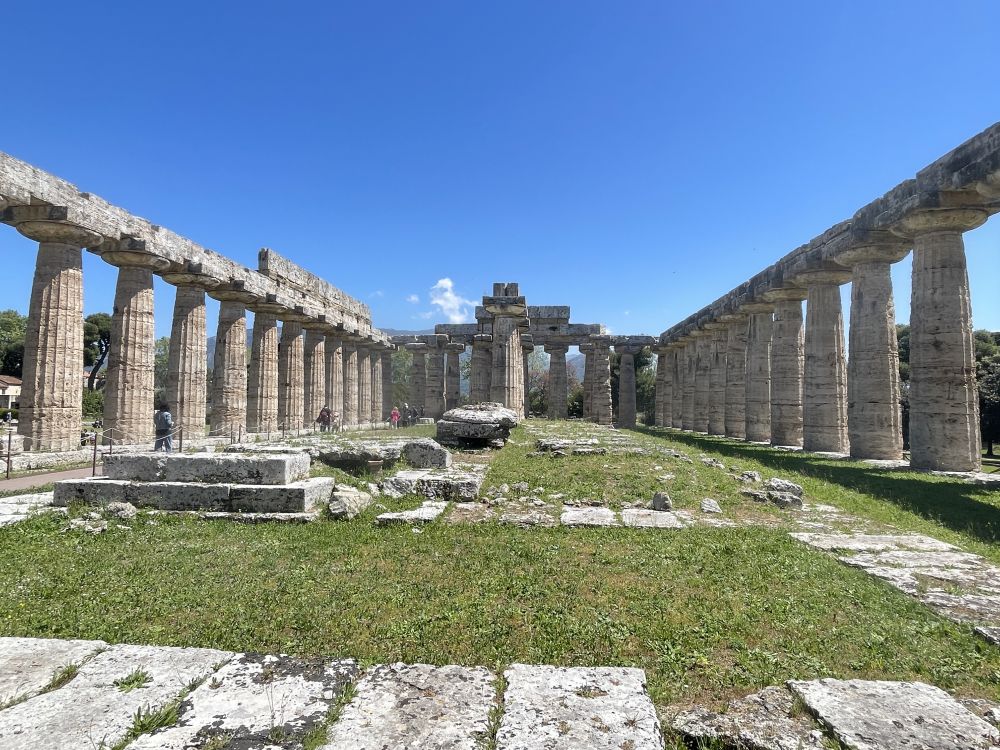 乘渡轮到阿马尔菲海岸东端的萨莱诺,租车沿E45公路前往马泰拉,全程近三小时。启程约15分钟后,岔路,在巴蒂帕利亚Battipaglia转南,沿SP135接SS18,再行驶二十多分钟便到达帕埃斯图姆Paestum考古公园。这里是古希腊与古罗马遗址所在地。遗址靠近海岸,四周平原开阔,远处可望意大利南部丘陵。自然环境保存良好,绿色草地与古老建筑形成鲜明对比,使人更容易想象古城的空间布局。