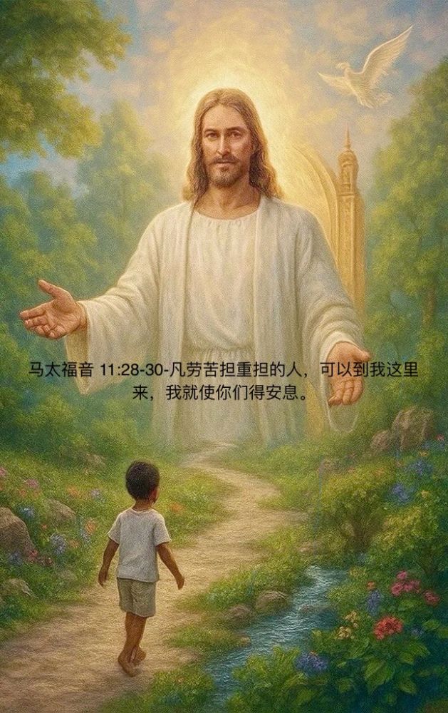 我将盒饭放在床前的书桌上,好奇地打开卷成筒的白纸,但见一幅彩色的福音画展现在面前,画面正中是身穿白袍的耶稣慈详地张开双臂,画的下方有一行小字:
