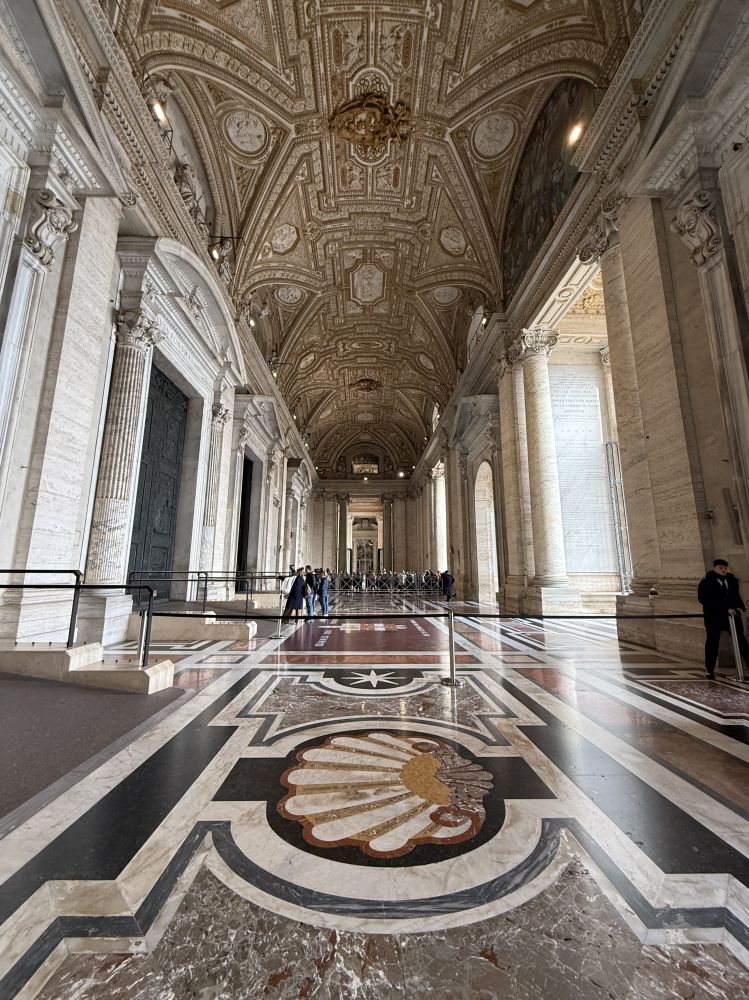 圣彼得大殿外的长廊以及精美的大理石地面。
