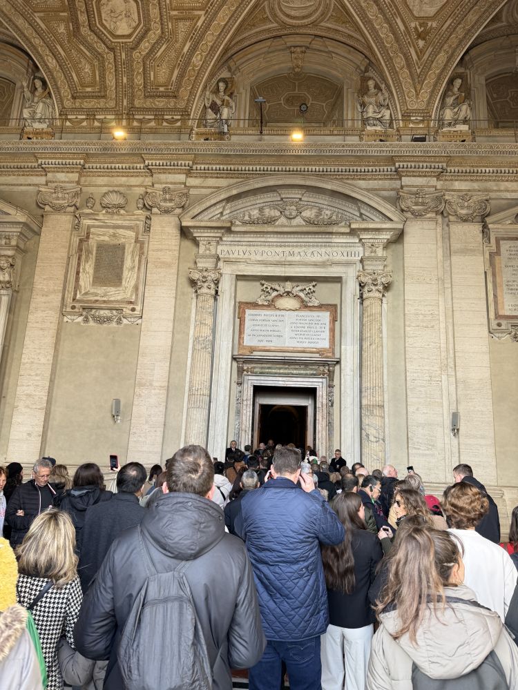 因为是禧年,又临近圣诞,所以有许多信徒和团体来朝圣。我们还是排了半个多小时的队过安检。看看我们前面排队进圣门的人吧。