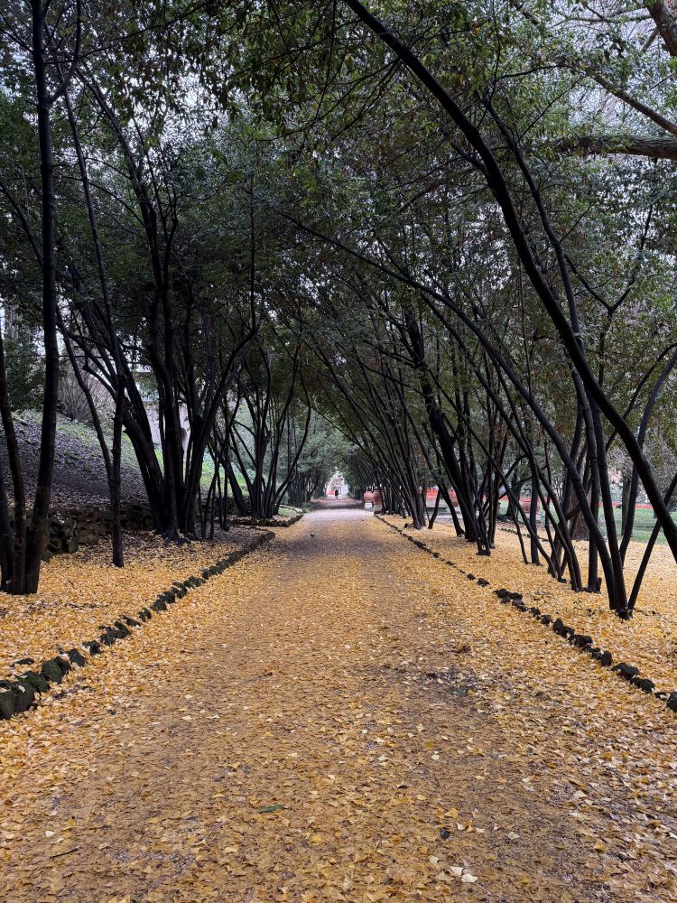 好像是一个公园,落满银杏叶的小径,附近也有休闲遛弯的市民。