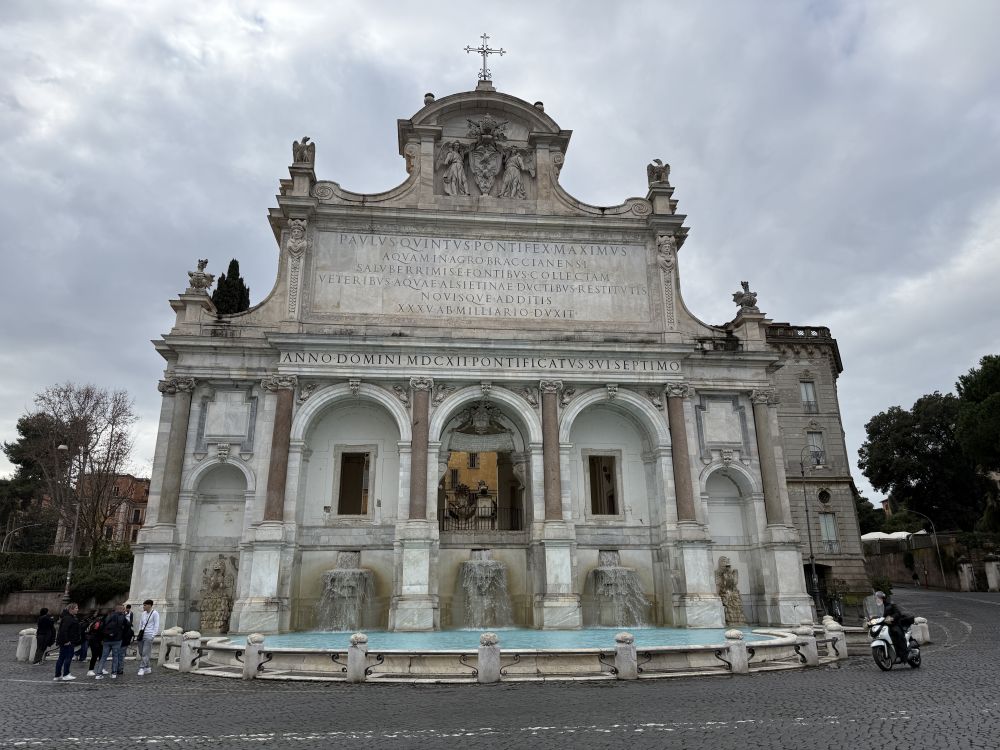 保罗喷泉(Fontana dell'Acqua Paola),据AI介绍,“保罗喷泉是罗马贾尼库洛山(Janiculum Hill)上的一座著名的纪念性巴洛克喷泉,常被称为"Fontanone"(大喷泉)。它由教皇保罗五世委托建立,于1612年竣工,旨在庆祝古老的Aqua Traiana输水道的修复,为罗马特拉斯提弗列区(Trastevere)供水”。据说它是许多文学作品和电影的取景地,包括著名的‘罗马假日’。