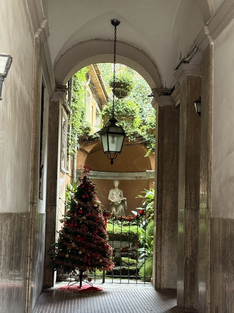 路过一座楼的门庭,看到的圣诞装饰和庭院里的一角。