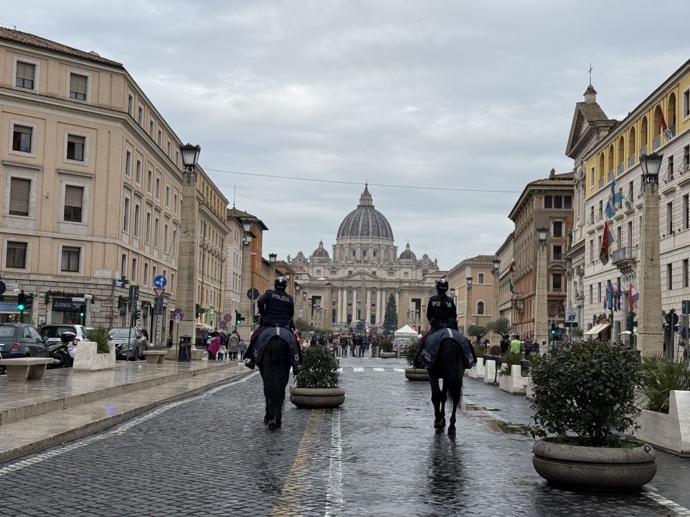 今天出门依旧先到圣天使堡和梵蒂冈打卡,然后再往保罗喷泉的方向走,一路走一路逛,看到开门的教堂就进去参观。在梵蒂冈前面的大街上看到骑马的巡警。