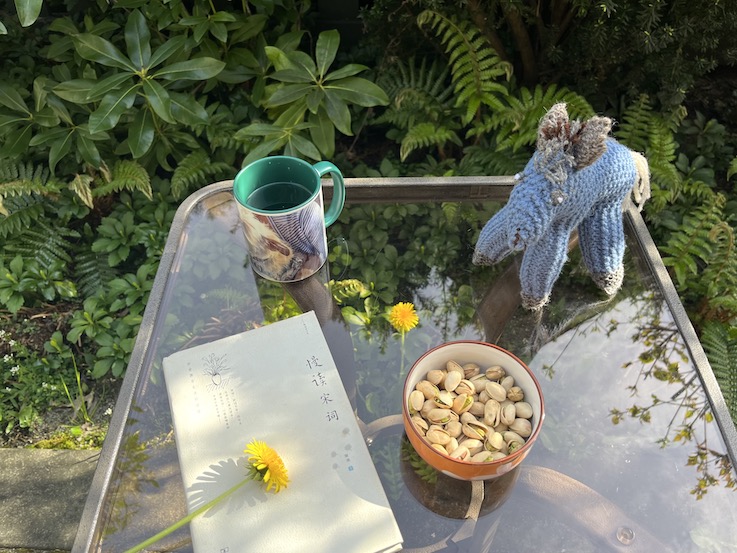 在小院的一隅, 在淡风也飒飒的周日下午, 边吃开心果, 边给你写信. 我有一个见识, 早起的人犀利, 具备干大事的潜质. 显然我不是. 曾经和你说过, 当不须每天接送孩子时, 我要调整一下生物钟和生活的节奏, 第一件事就是要睡到自然醒, 将诊所的第一个 appointment 约在九点, 甚至十点, 可以迟些下班回家, 反正下午三时许, 再也不用去接他们放学, 不用带他们在全城赶场各种各样的 activities, 打球, 游泳, 弹琴, 画画等等. 现如今, 压根儿就没必要早起, 却, 莫名的, 七点左右傻傻的醒来, 难不成太阳从西边升起, 本猫大器晚成乎?