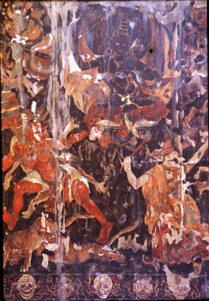 底部奔驰着两匹淡蓝的天马,正在用前蹄攻击和争食恶人的内脏。西藏寺院中常见这类图像,乃琼寺则尤为集中,想起中世纪和文艺复兴,画匠笔下的地狱,人类的思索与认知竟不可思议般相似。