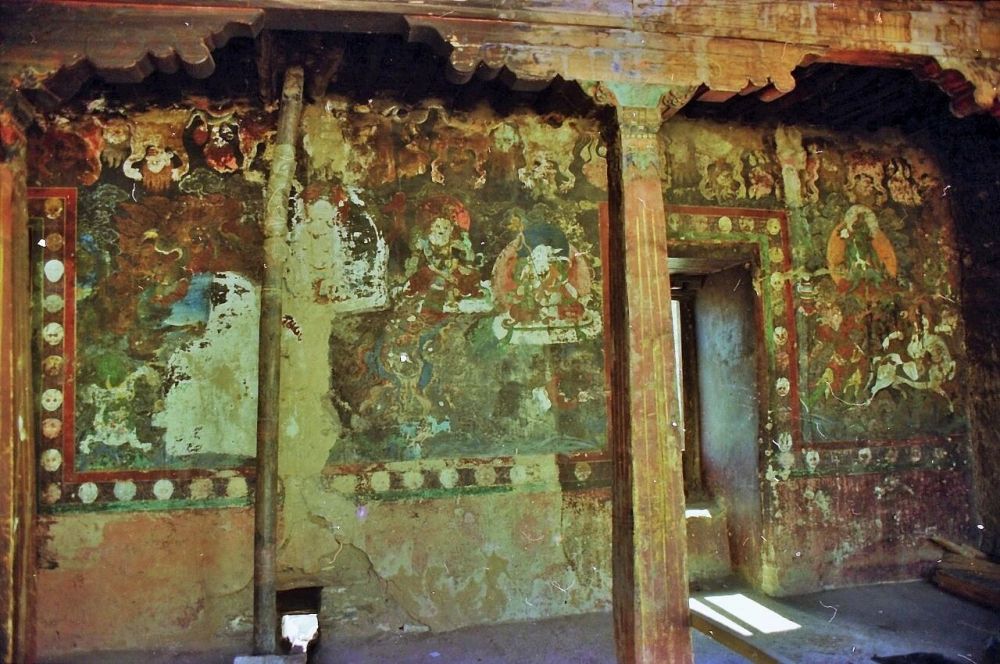 那年寺内刚完成基础维修,转了一圈,能看到起码解决了屋顶的漏水问题。存有壁画的回廊中,大部分由当地人搭了房子居住,长年累月的烧茶取暖、油灯熏染,给壁画造成了较大损害。划痕、剥落,雨水渗漏冲刷后的痕迹明显可见。部分壁画上遮掩着报纸,也许是有人试图保护这些寂寥的古迹。