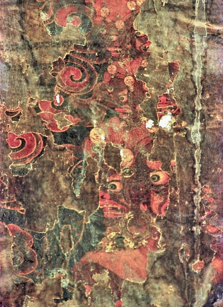 当时也拍下了这幅保存最完整的“地狱图”壁画:右上红色火焰中的护法神因世间的罪恶而张嘴咆哮,他和披盔戴甲的天神武士们,挥舞着数不清的兵器,驰骋于青绿山水间,追逐着一群罪人。尽管它的图像令人深思、也易于理解,我反倒没有去临摹——得承认,自己对时光侵蚀后的残缺之美始终保持着更高昂的激情。