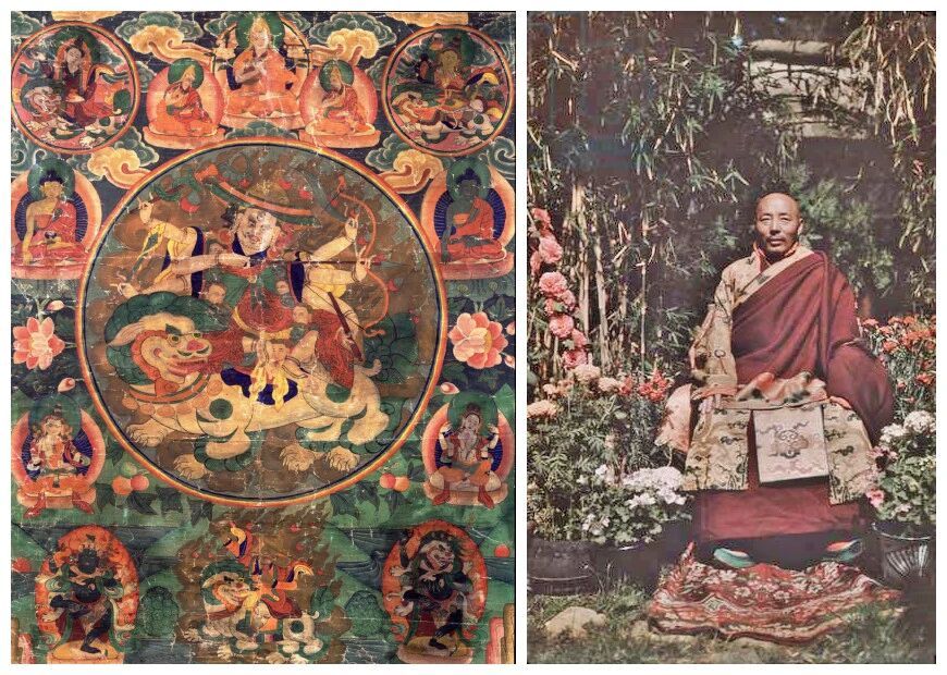 左:古代白哈尔唐卡局部 右:1936年 花园中的乃琼神谕