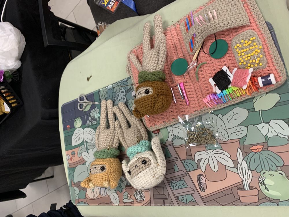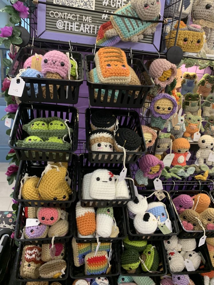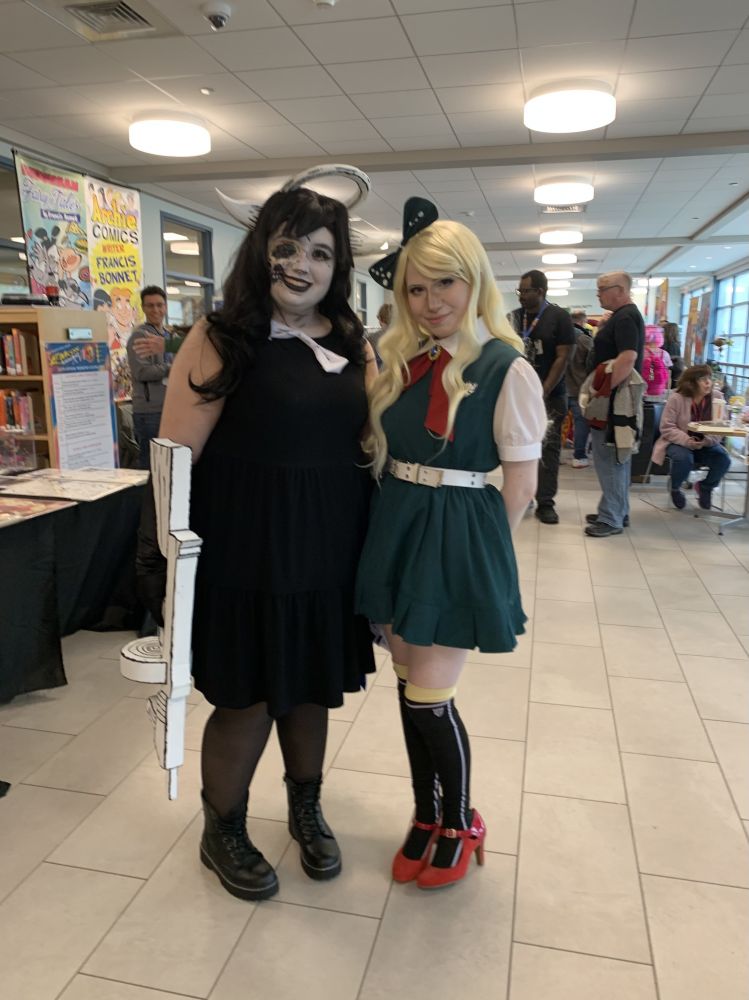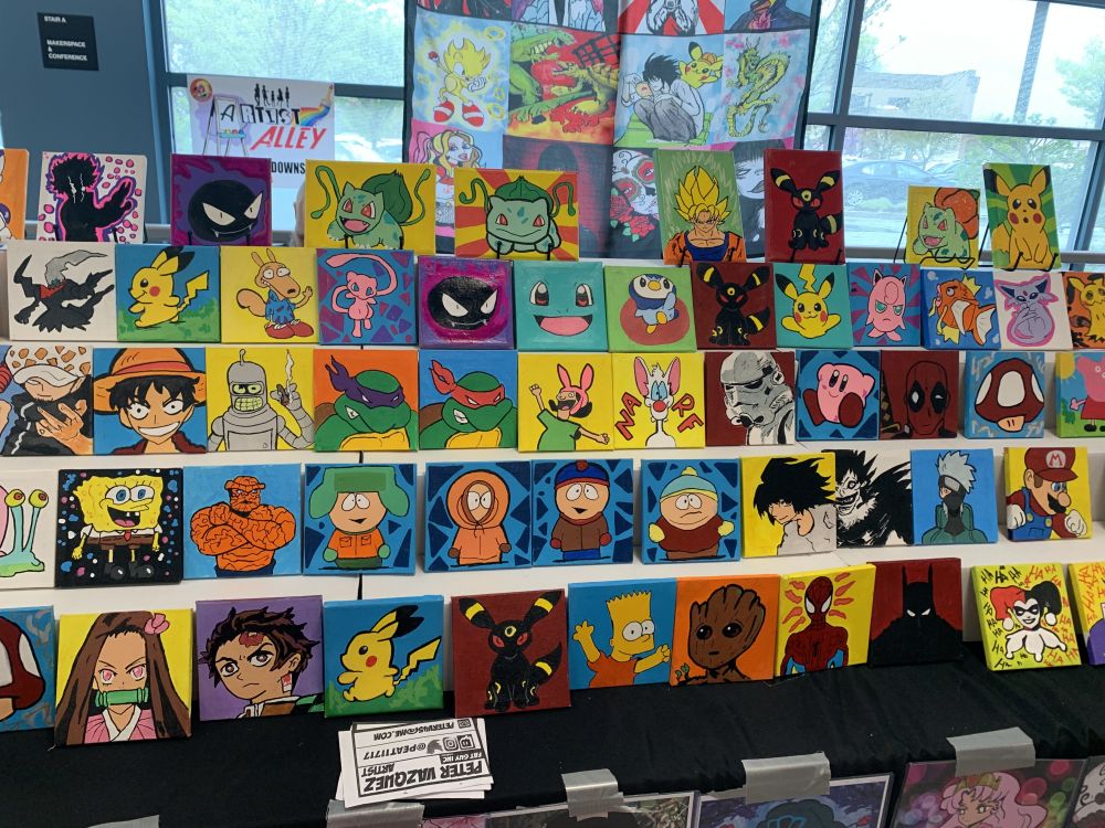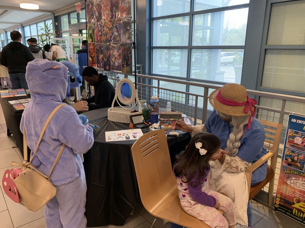 我们进得馆内,看到走道各处布满Vender,都是售卖动漫相关品的。有编织的动漫人物/动物小模拟形象,有动漫人物小油画画像,有相关书籍,有彩绘动画人物在脸上手上的彩绘师摊位,还有个女士似是动画布偶演绎者,用尖细的动画声音介绍她的布偶剧人物。。。林林总总。我还看见组织者,一个高高壮壮的壮年黑人组织者。我跟他还有些交道,不觉低下头闪身过去。