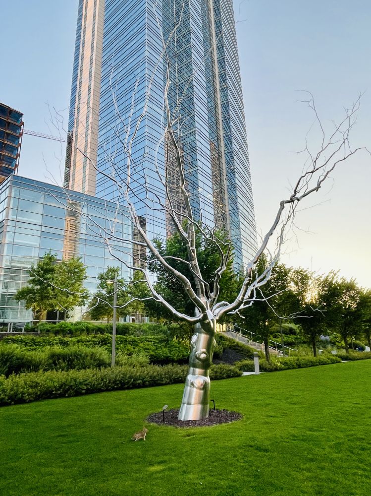 罗克西•潘恩的作品《Dendroids》系列,完成于2018年,使用不锈钢管材混凝土建成。艺术家反思机械化生产以及人类对自然力量施加秩序和控制的冲动。他的树状机器人系列体现机械化和自然系统关系。从人体血管、神经网络中提取的形状被呈现在不锈钢轧板中。