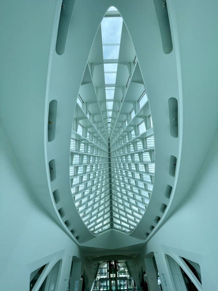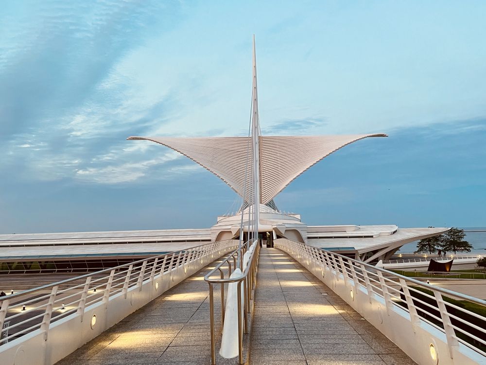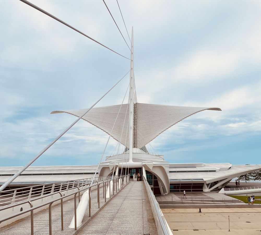 密尔沃基艺术博物馆坐落于密歇根湖西岸、始建于 1888年,后由世界著名建筑师圣地亚哥·卡拉特拉瓦设计改建,它的翼楼,带有一个可移动的遮阳板,展开的方式类似于鸟的羽翼,钢结构羽翼会像翅膀一样慢慢张开,像一只展翅飞翔的白天鹅。白天展开翼展为217英尺(66米),夜间或恶劣天气时折叠。翼上的传感器监测风速,因此如果风速超过23英里每小时(37公里/小时)持续三秒钟,翼会关闭。该展馆于2004年获得国际桥梁与结构工程协会颁发的杰出结构奖。