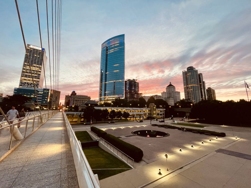点亮霍安桥—在密尔沃基夜景中,霍安桥的灯光变幻色彩和动态序列引人注目。大桥始建于1972年,由于当时民众对高速公路建设强烈反对,这座横跨密尔沃基天际线的钢铁巨构直到1977年才通车,成为城市重要交通枢纽。2018年5月,一项名为“点亮霍安桥”的民间倡议正式启动,旨在通过LED灯光系统赋予这座桥梁全新的生命力,2020年10月22日正式亮灯。这一项目的影响力超越了党派界限,先获得民主党全国代表大会, 2024年起也获得共和党全国大会支持,为“点亮霍安桥”的筹款努力提供支持。