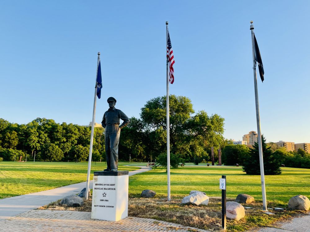 麦克阿瑟像—跑出密尔沃基市中心,途经密歇根湖畔的维特兰公园。七月的晨光温暖和煦,却被湖面拂来的微风染上一抹清凉。目光被公园里一处铜像吸引,原来是麦克阿瑟五星上将。