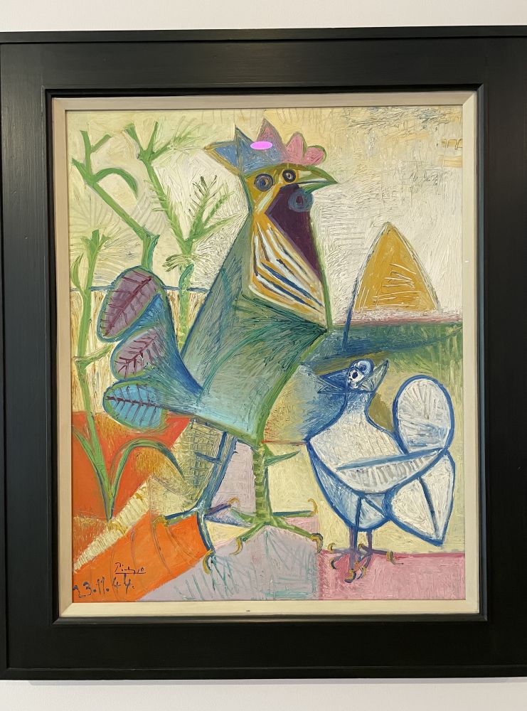 馆藏毕加索(1881-1973)作品,1944的油画《解放之鸡》。背景是1944年8月,毕加索在巴黎目睹法国脱离纳粹军队的占领,画下这幅色彩明亮缤纷的油画,表达法国重获自由的喜悦。