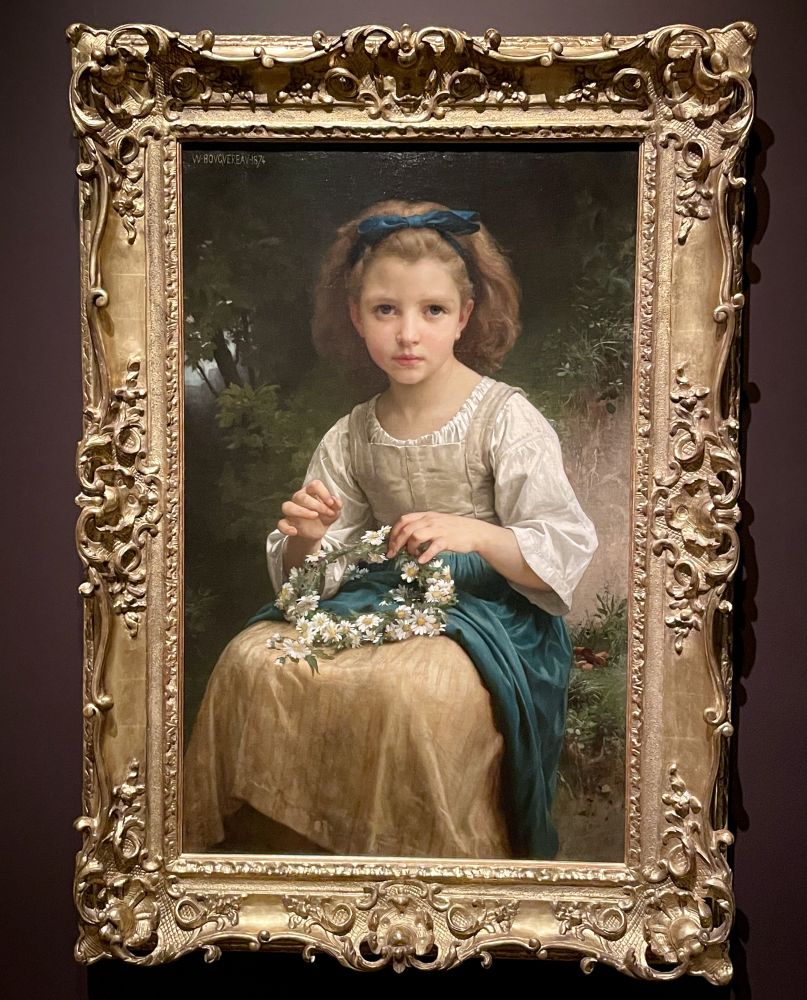 法国画家威廉-阿道夫·布格罗 (1825-1905) 1874 年油画《编花冠的女孩》。画中坐着的小女孩暂停了手工,抬起右手,注视前方,体现了春天、青春和纯真,具有不可否认的魅力。这种类型的题材画让布格罗在美国声名鹊起。虽然他频繁地重访一些主题,但布格罗仅此一次使用了孩子编织花冠的主题。这幅画1925年后由一个美国家庭收藏,那时布格罗的作品并不那么受欢迎。