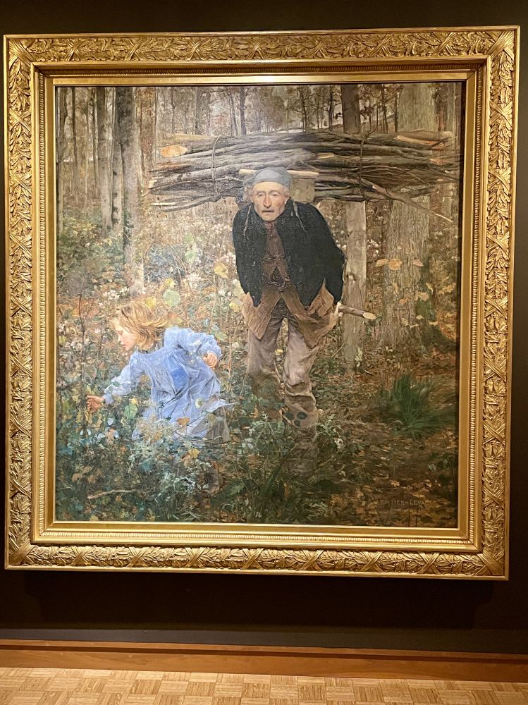 法国画家朱尔·巴斯蒂安-勒帕热于1881年创作的一幅油画。1882年在巴黎沙龙展出,目前收藏于密尔沃基艺术博物馆。这幅描绘场景的作品吸引了很多游客驻足欣赏。这一老一少在衣着、动作、对未来生活的期盼形成强烈对比,直击人心—一位老人在森林中背负沉重的木材,前面有一个小女孩忙着采摘小花。老人实际上是画家的朋友,女孩是他孙女。构图由几个对立面形成:一位上年岁老人的背上背负的木材横向的枝条与森林树木的垂直树干之间的对立;老人与小孩的对立,他们的姿态在疲惫与快乐的无忧之间变化,老人的衣服的深色与背景融为一体,而小女孩的蓝色裙子与秋天的橙色相辅相成。蓝色已经在山坡树木间的天空中显现。调色板还包括前景的绿色叶子,强化了生与死之间的最终对立,老人与年轻主角的老年与青春,如他们的目光所示,老人直视观众,而小女孩则转过头去,因为她忙着采花。这幅画似乎反映了艺术家受到印象派画家和更传统的自然学派的影响,为他赢得了评论界的赞誉。
