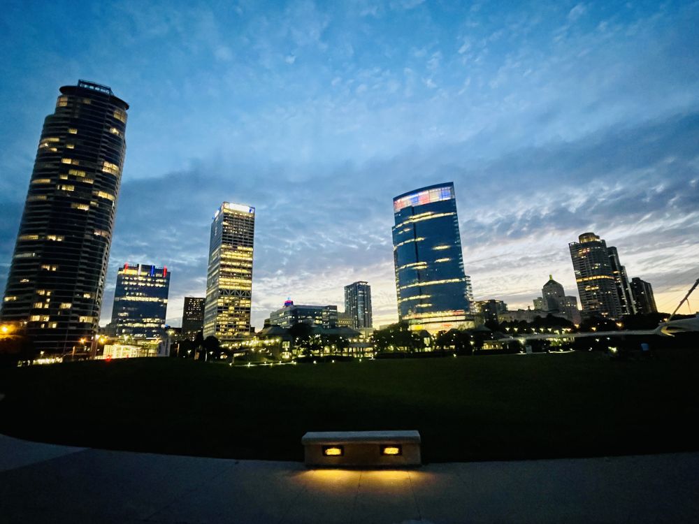 时逢独立日假期,城市建筑物上展示国旗红蓝白三色。