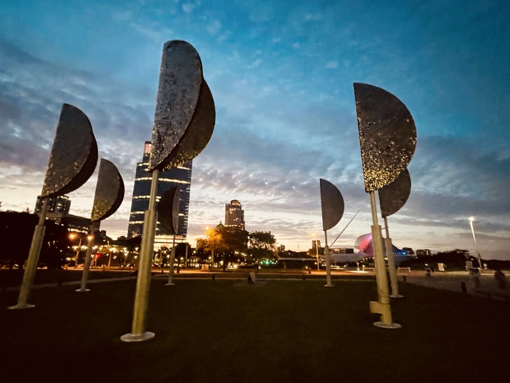 密尔沃基《探索世界》主题公园广场前的光电风帆,随光源强度不断改变方向。