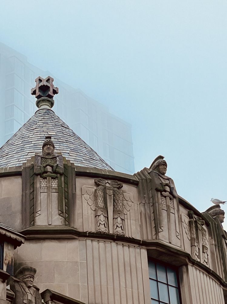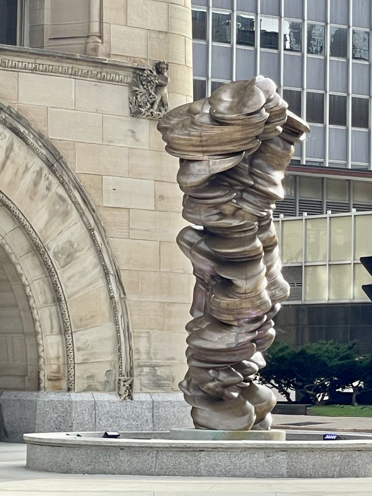 艺术家托尼·克拉格的作品《混合感受》。克拉格是一位英国艺术家,以使用各种材料表现抽象艺术形式而闻名。这件作品2018年安装在市政厅门前,由两座交错的塔楼组成。观众在雕塑周围移动脚步时,可以发现人体的轮廓。