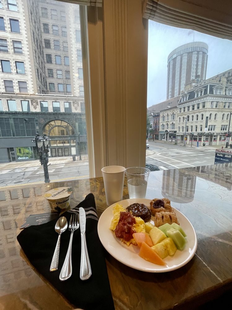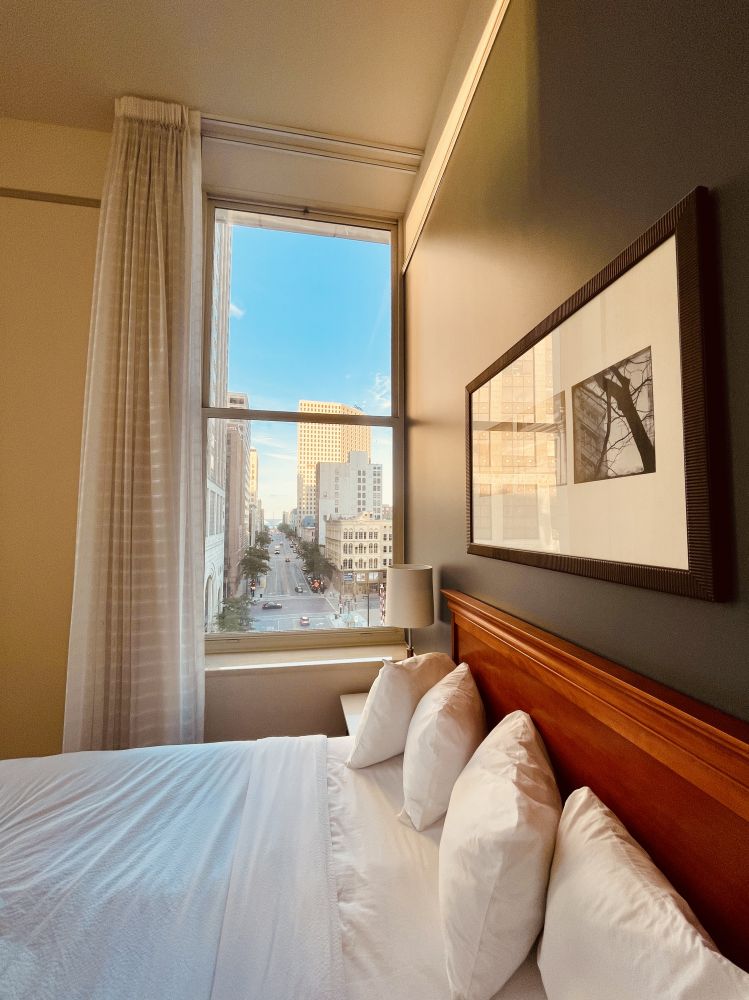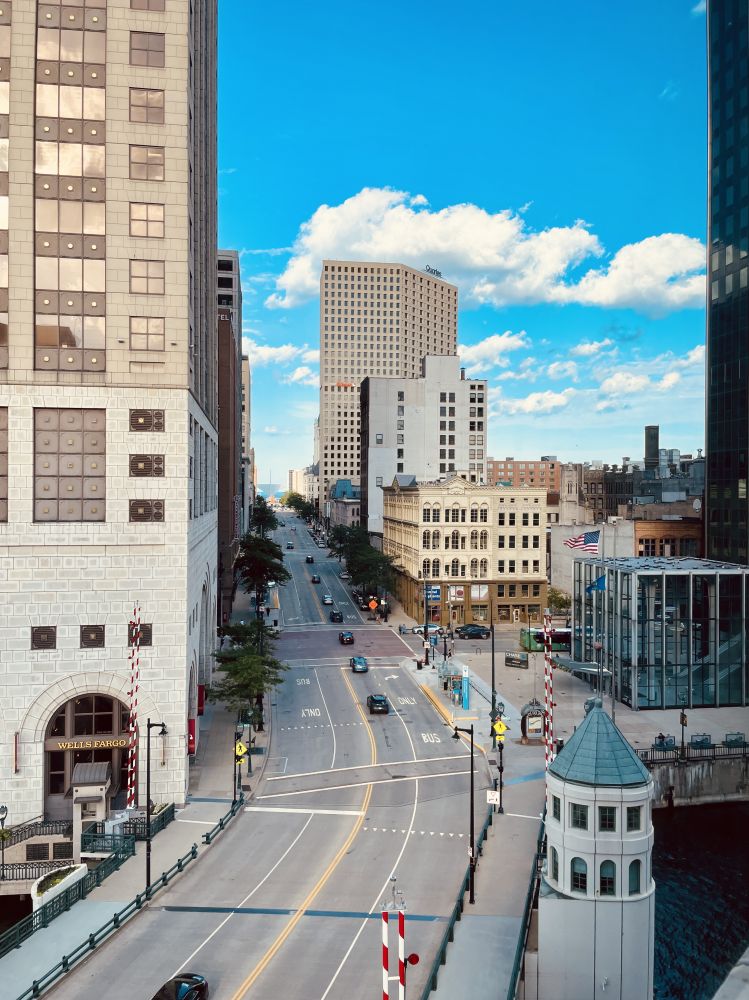 密尔沃基酒店攻略—七层万豪居家酒店(Residence Inn)套房520房间(及320,420,620和720)拥有最佳观景, 从房间里可以看到密尔沃基艺术博物馆的飞翼,密尔沃基河和那只二战中轰动全美的格提母鸭。窗口正对威斯康星大道的斜桥,连接着基尔伯恩镇和朱诺镇对不齐的街道。
