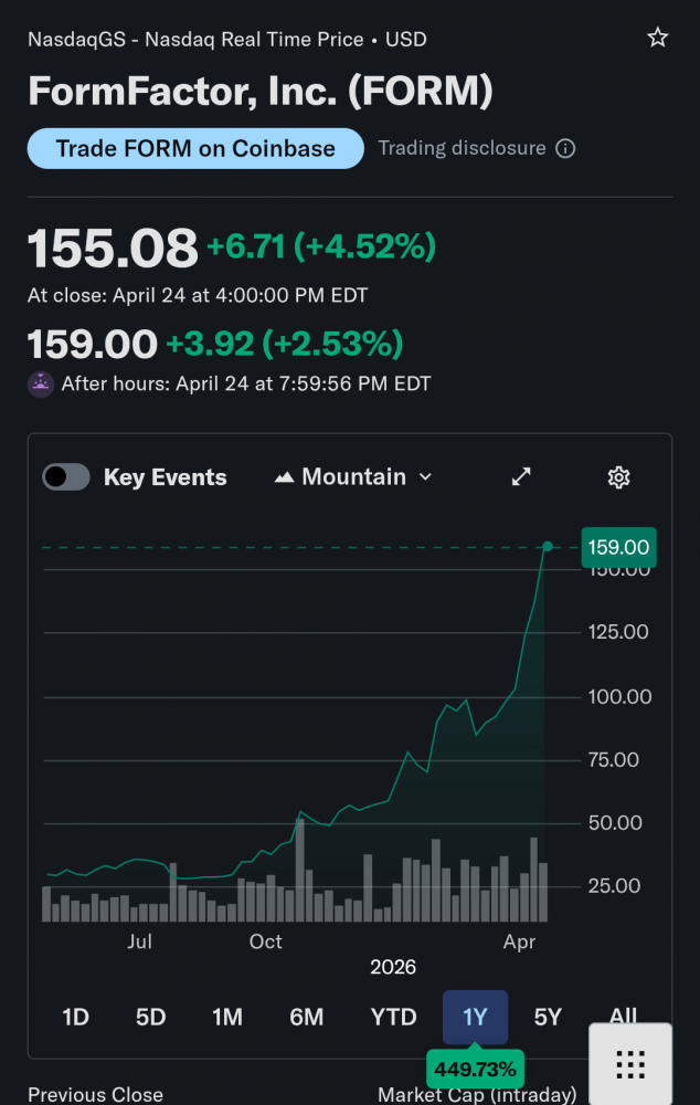 硅谷工匠 (2026-04-25 04:50:09) 评论 (4)一个和存储沾点边的企业,做存储芯片的质量检测的,半年股价上涨五倍。