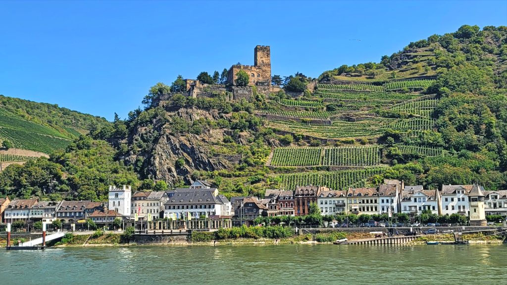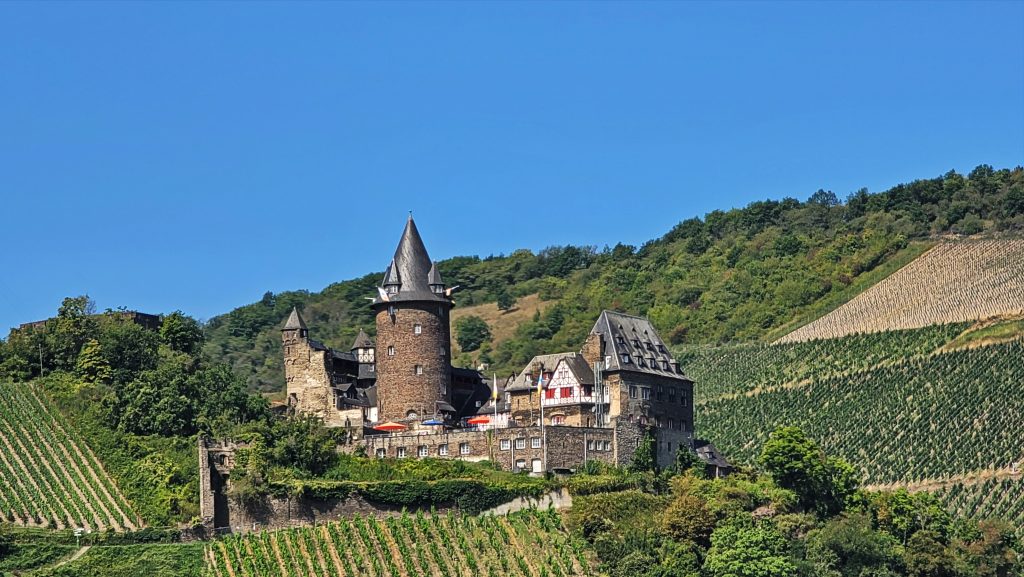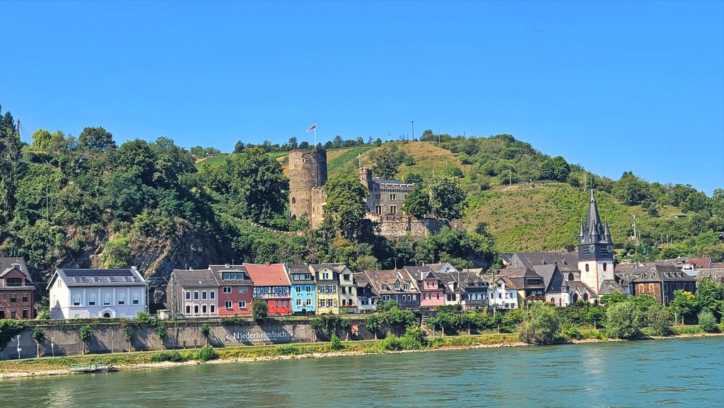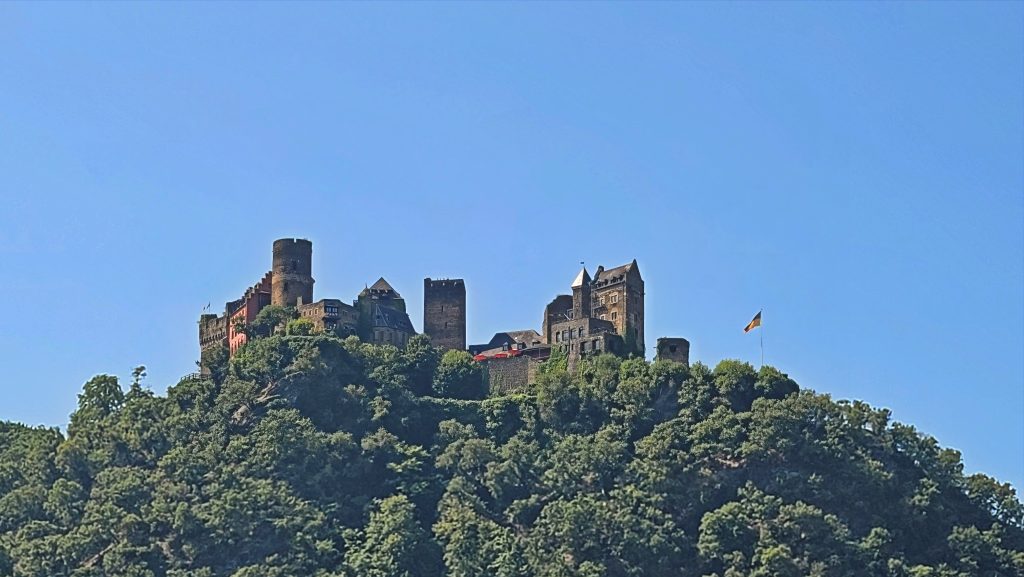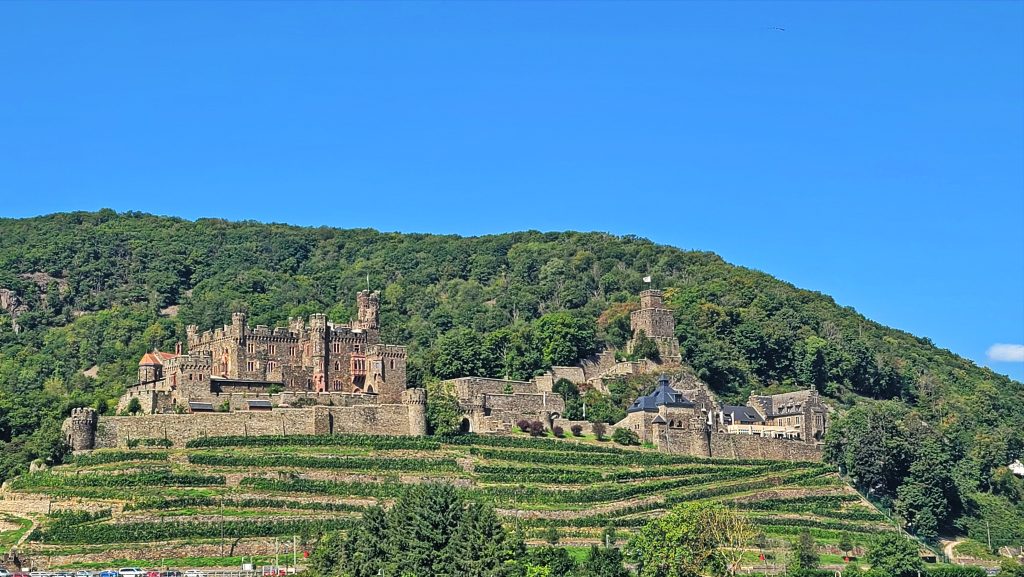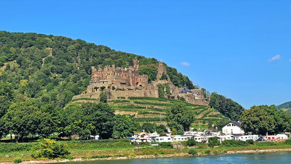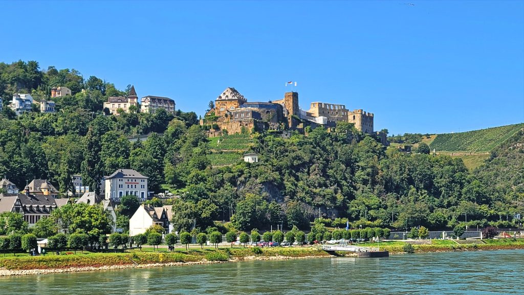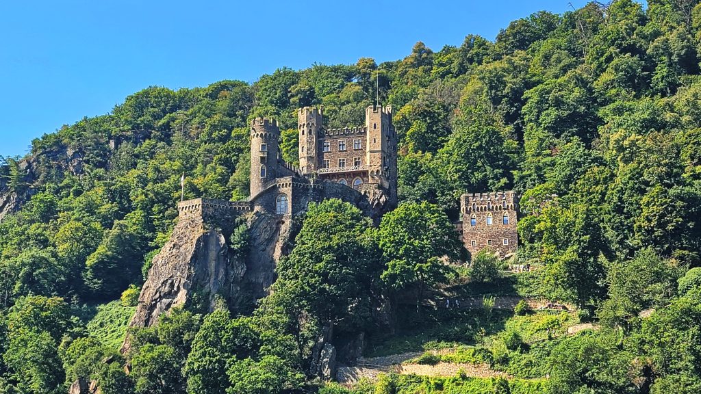 在莱茵河中游,历史悠久的城堡接连不断映入眼帘,在莱茵河上方约 260 英尺处,耸立在一块突出的岩石上的,是雄伟的莱茵斯坦城堡(Burg Rheinstein)。它建于 1316-1317 年左右,后来年久失修,直到 19 世纪在普鲁士王子腓特烈的统治下重建,成为莱茵浪漫主义的典范。