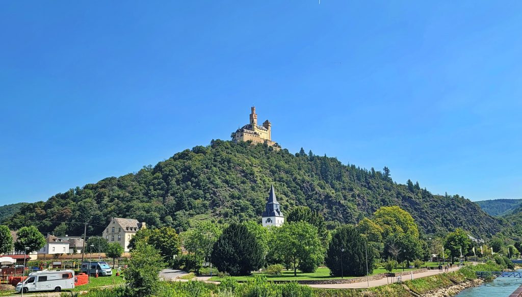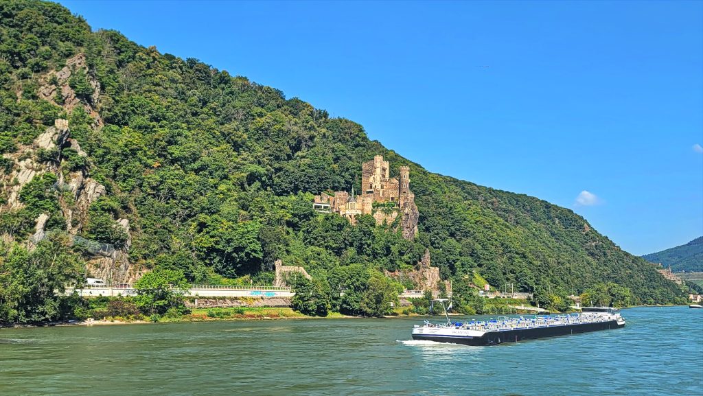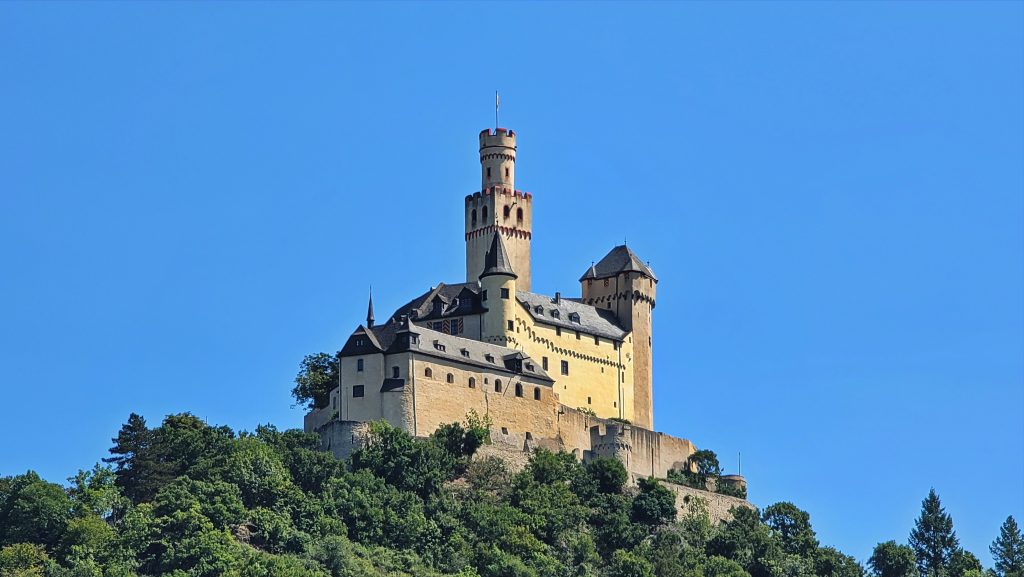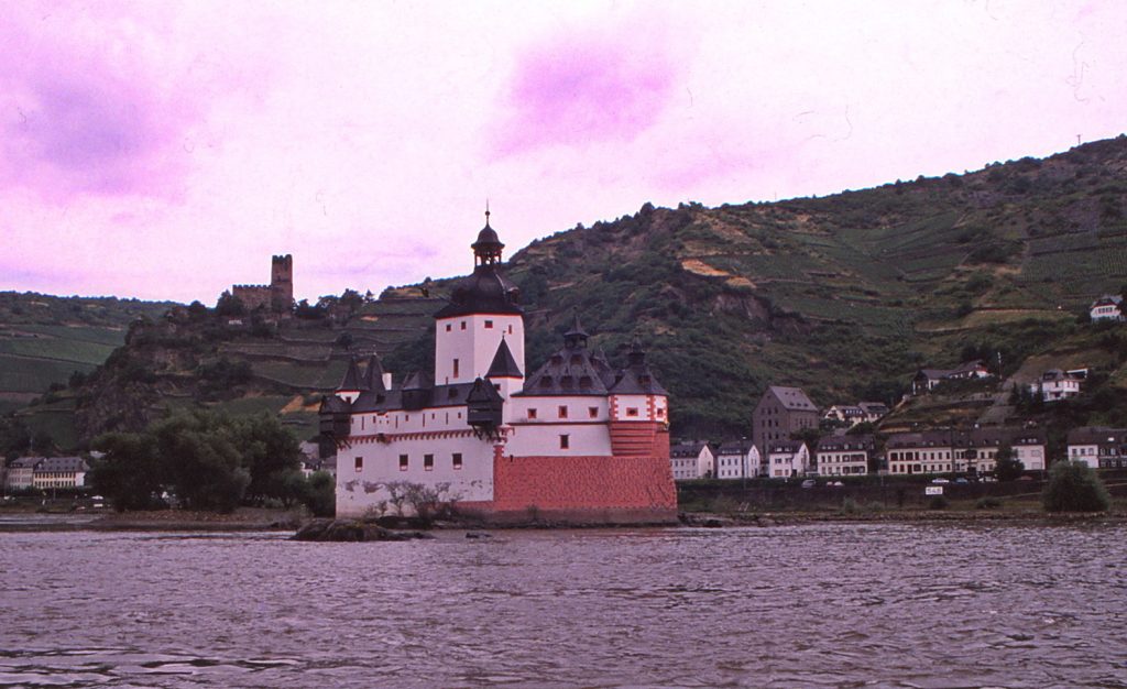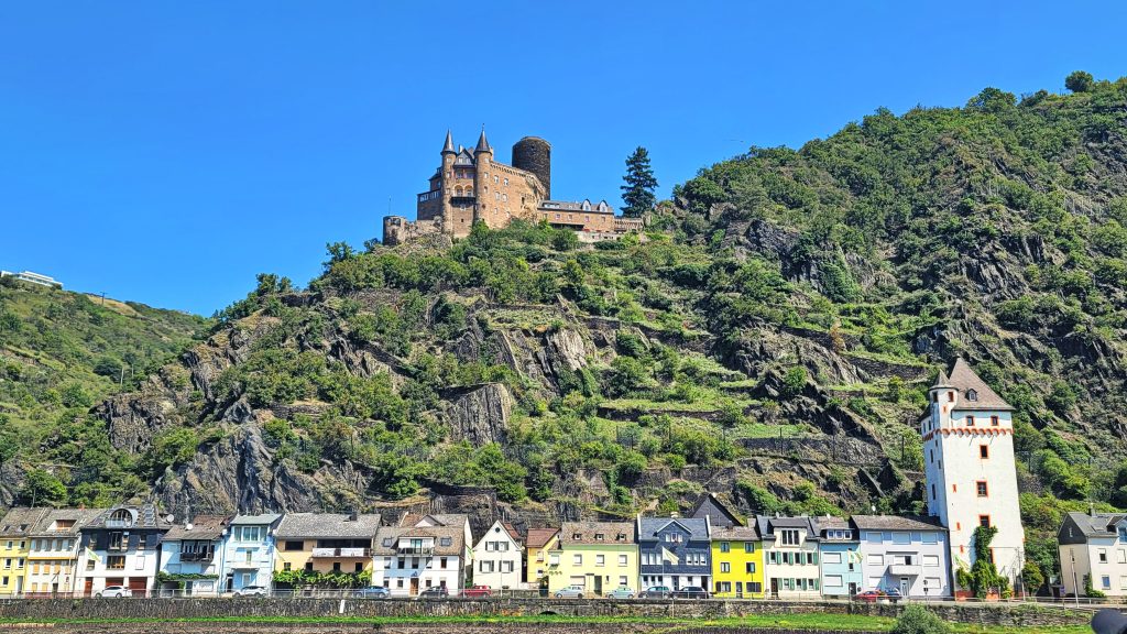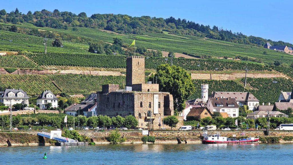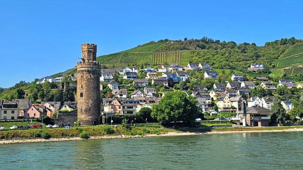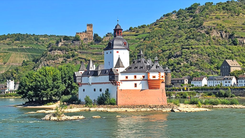 在莱茵河中游,历史悠久的城堡接连不断映入眼帘,在莱茵河上方约 260 英尺处,耸立在一块突出的岩石上的,是雄伟的莱茵斯坦城堡(Burg Rheinstein)。它建于 1316-1317 年左右,后来年久失修,直到 19 世纪在普鲁士王子腓特烈的统治下重建,成为莱茵浪漫主义的典范。