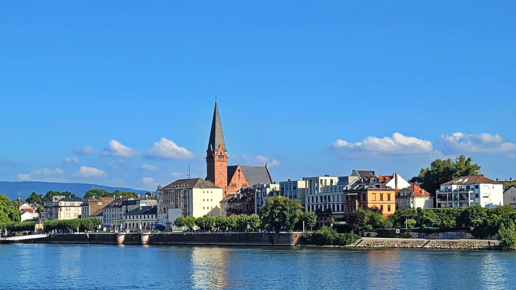 当我们在翌日的晨曦中醒来,河轮已驶过法兰克福莱茵-美因地区的凯尔斯特巴赫小镇(Kelsterbach),中心显眼的教堂是圣心教堂(Herz-Jesu-Kirche)。