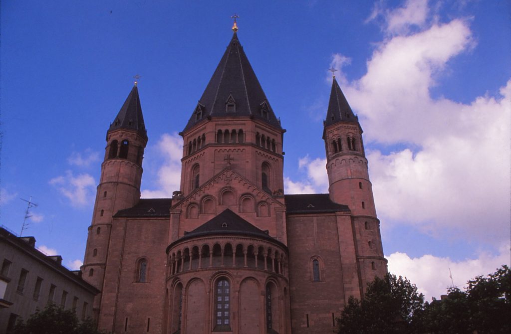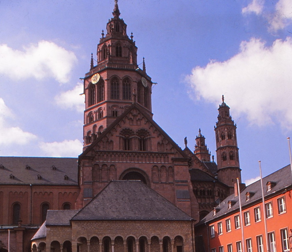 莱茵河畔的美因茨市中心,展现出一幅厚重而优雅的城市天际线。这座拥有两千多年的历史的城市,最初源自罗马时期的军事要塞。城市上空最醒目的,是那座红棕色的美因茨大教堂。