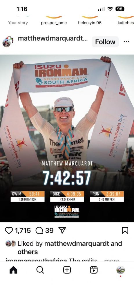 那个周末也是Ironman南非大铁的日子,Matthew Marquardt (普林斯顿大学游泳队本科毕业生 - 曾经是康教授的学生,目前是职业Ironman运动员和俄亥俄大 学医学院四年级学生,即将毕业)夺得男子冠军并打破赛道纪录。很难想象他10天前刚刚完成长达9小时的医学院执照考试,居然能在这样的压力下,在Ironman比赛中得冠军。