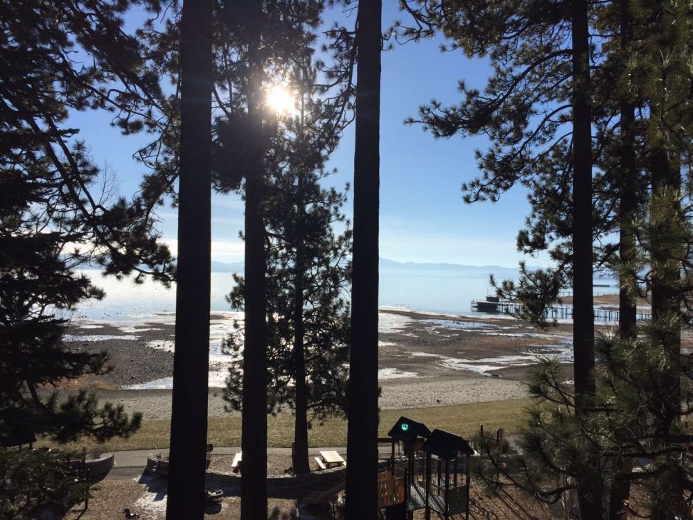 原计划11月12-13日孩子们带我们去滑雪,但由于老天一直不下雪,滑雪场不得不关闭。我们预定好的宾馆也只好延期,宾馆给我们安排到12月10日。等了一个月,我们终于可以如期出发了。天还没亮,我们就带着滑雪装备,开车向太浩湖的方向驶去。太浩湖是位于北加州的一个高山湖泊,去年夏天,儿子和媳妇曾带我们去那里游玩过。夏天的湖水清澈湛蓝,依偎着叠峰异彩的山脉[