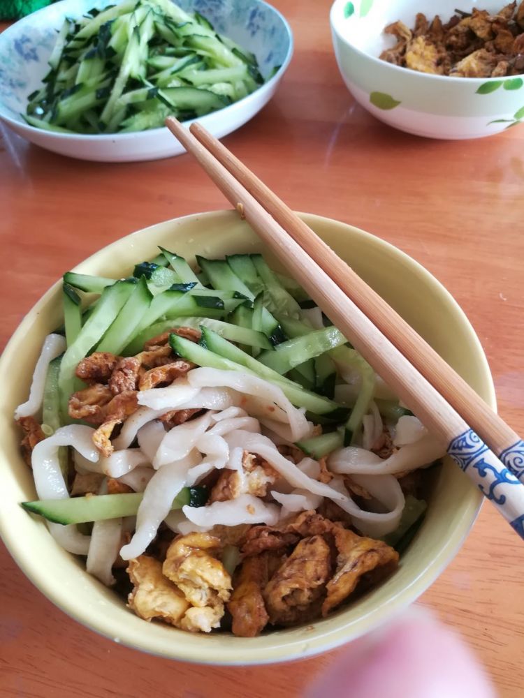 来美国之前,我是很少在家里自己擀面条的,因为吃碗面在国内是太方便了,到处都是各种风味的面馆,手擀面也不稀罕。可到了美国之后,想吃碗面就得自己做了,尤其是手擀面必须自己做。擀面条对我来说轻车熟路,我也从不觉得手擀面有啥麻烦,所以我们家经常吃手擀面,一家三口的手擀面我连做菜码和酱料,一个小时就完活。