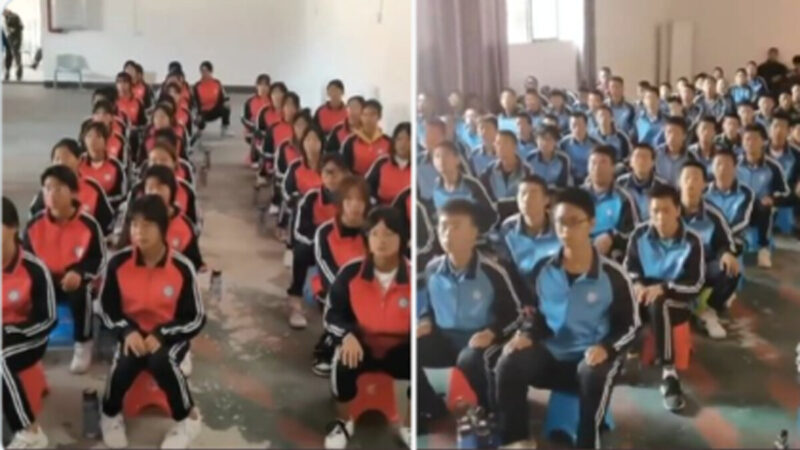 网传中国某地中学生,疑似被学校组织起来统一着装集体观看中共二十大会议直播。(网络截图)