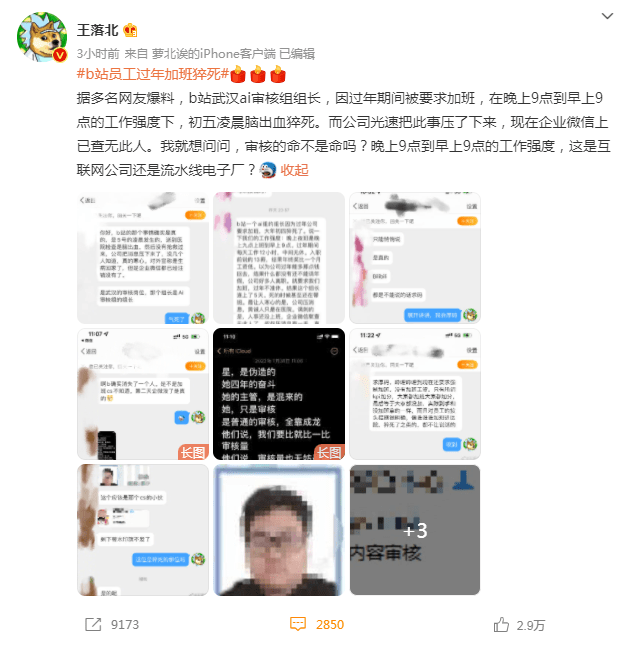 文章来源:立此存照于2022-02-0801:51:52-新闻取自各大新闻媒体,新闻内容并不代表本网立场!(被阅读78603次)A-AA+2月7日是春节假期后的第一个工作日,有网友爆料称,B站武汉AI审核组组长在过年期间因加班猝死,其工作时长达到每天12小时,且经常日夜颠倒,死前已连续上班5天,在大年初五凌晨脑出血猝死。有匿名爆料者还称B站正试图压制消息,甚至已将该员工的企业微信注销,[