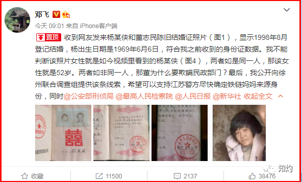 有网友冒着风险给邓记发来了杨某侠与董志民的结婚证,结婚证上显示杨某侠的全名为杨庆侠,结婚证的颁发日期是1998年8月2日,登记机关是丰县欢口镇。