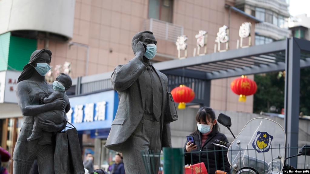 资料照片:中国武汉市,一名女子正走过带着口罩的雕塑面前。期间,世卫组织新冠溯源专家小组正在武汉考察。(2021年1月29日)自今年8月以来,中国官媒和官员集中传播了一波虚假信息,暗示COVID-19疫情背后的新冠病毒可能是在美国制造的。自疫情发展为全球大流[