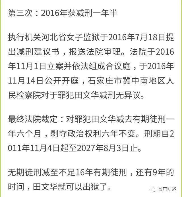 文章来源:慧画财经于2021-09-2920:16:10-新闻取自各大新闻媒体,新闻内容并不代表本网立场!(被阅读24559次)A-AA+2016年,河北女子监狱传出了一个惊人消息:给刚入狱两年的田文华申请第三次减刑。从2011年开始,田文华从无期徒刑减到了15年零3个月有期徒刑。而减刑的理由无一不是:表现良好。以此情况来看,她最早可能在2022年出狱,本以为田文华要"老死狱中",却传来消[