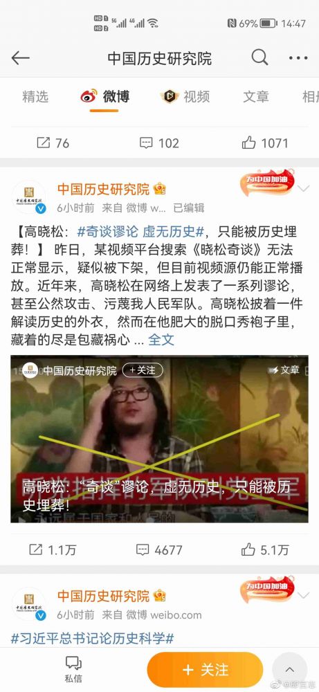 隶属于中国社会科学院的中国历史研究院8月28日发表题为《高晓松:“奇谈”谬论,虚无历史,只能被历史埋[