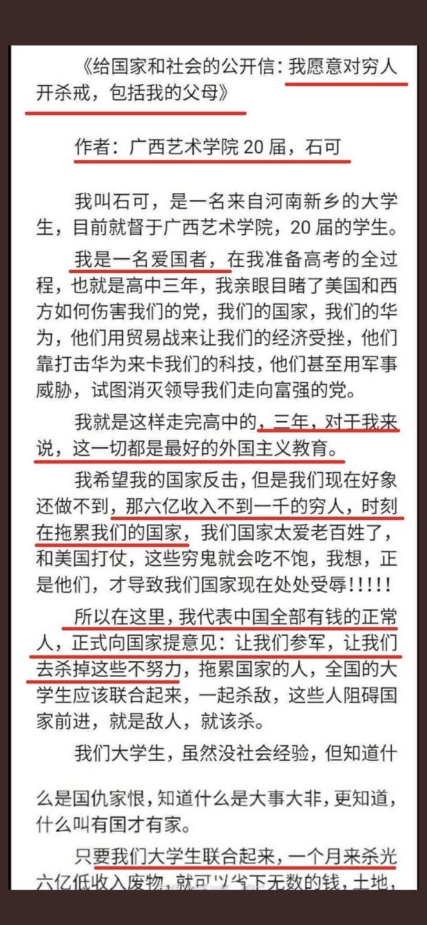 中国的社交媒体上热传一封署名为“石可”的二零二零届大学新生的《给国家和社会的公开信》。