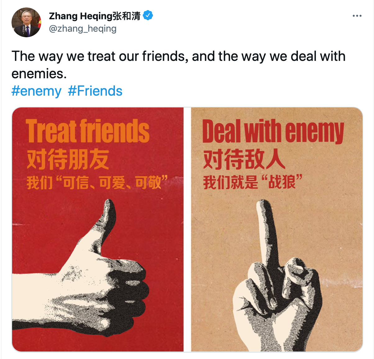 中国驻巴基斯坦外交官张和清今天(24日)在推特发文,指称:「对待朋友我们可信」、「对待敌人我们就是战狼」,附图中更出现「中指」图[